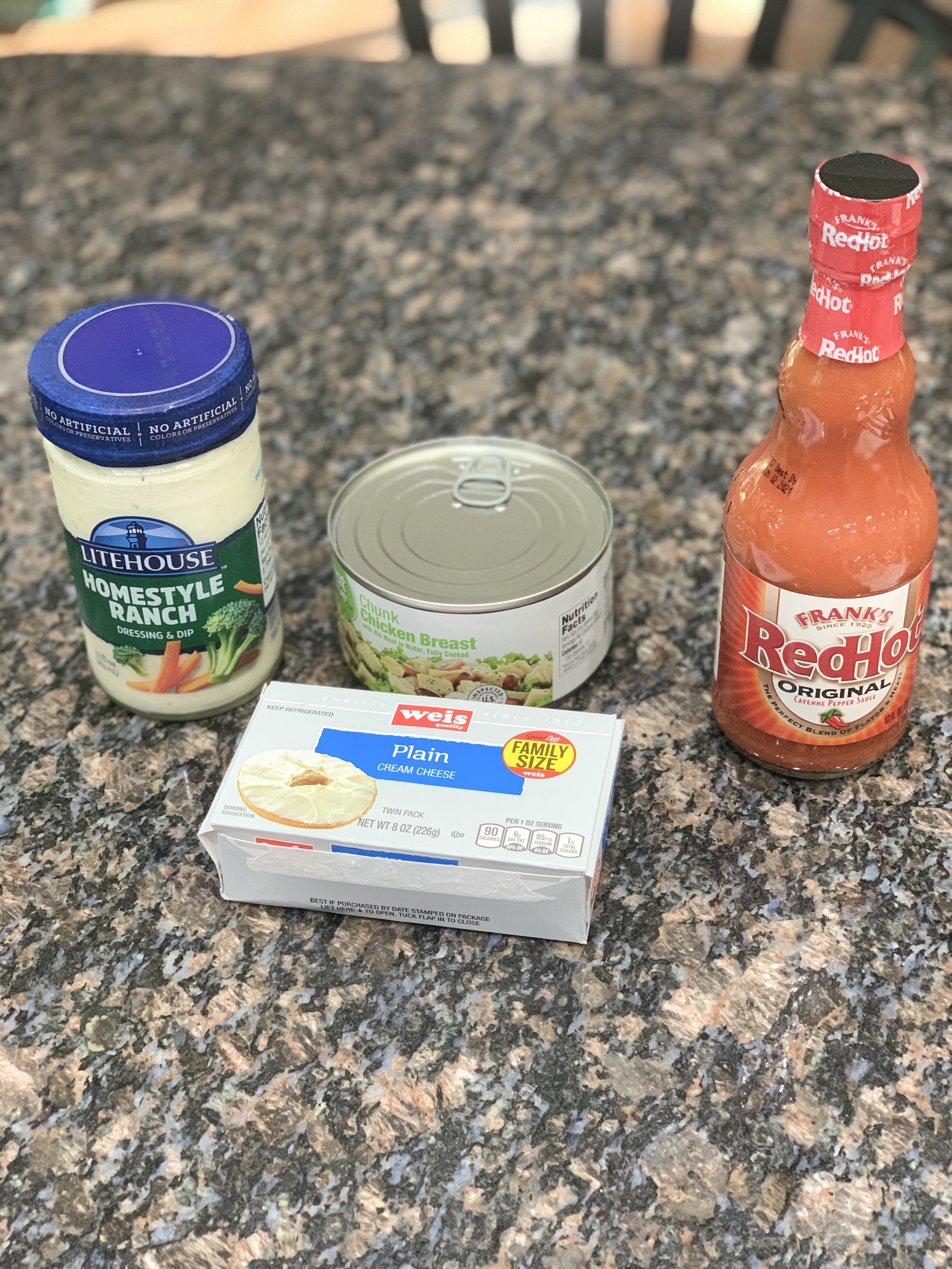 1. Blend softened cream cheese with shredded/pulled chicken.